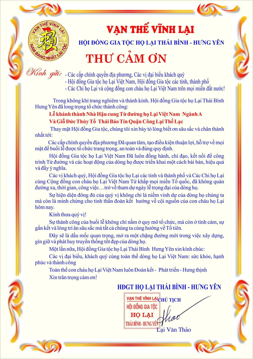 Thư cảm ơn của Hội đồng gia tộc họ Lại Thái Bình - Hưng Yên